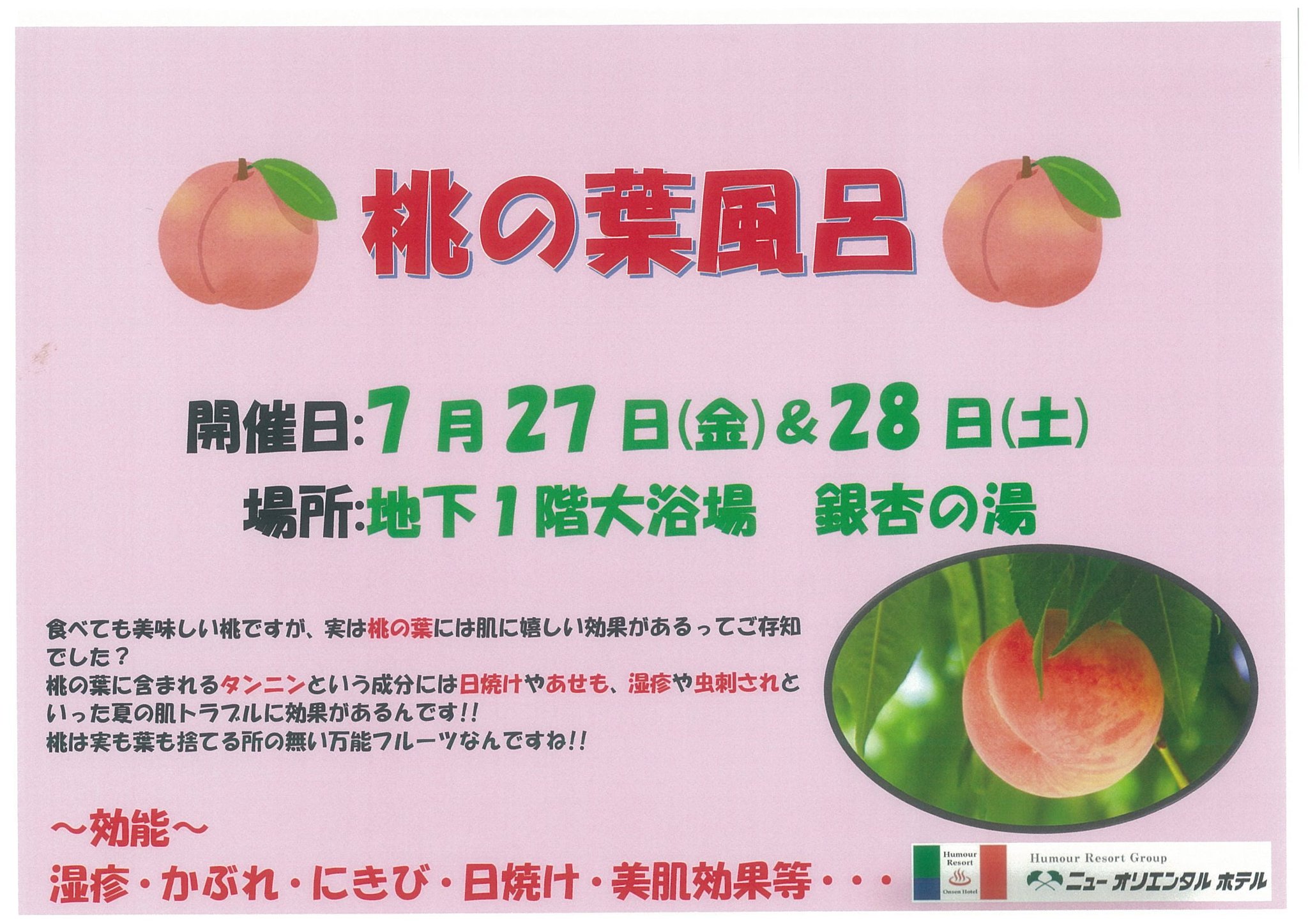 湯 モア電鉄 公式 温泉エンタメ城下町 太山寺温泉なでしこの湯 お食事処とりで お買い物楽市 On Twitter 予告 ニューオリエンタルホテル では7月27日 金 と28日 土 に 桃の葉風呂 を行います 桃の葉には肌トラブルに効くタンニンという成分が含まれ