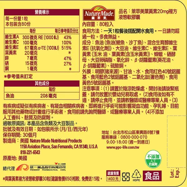 Nature Made 萊萃美葉黃素20毫克複合軟膠囊150粒 Costco 好市多線上購物