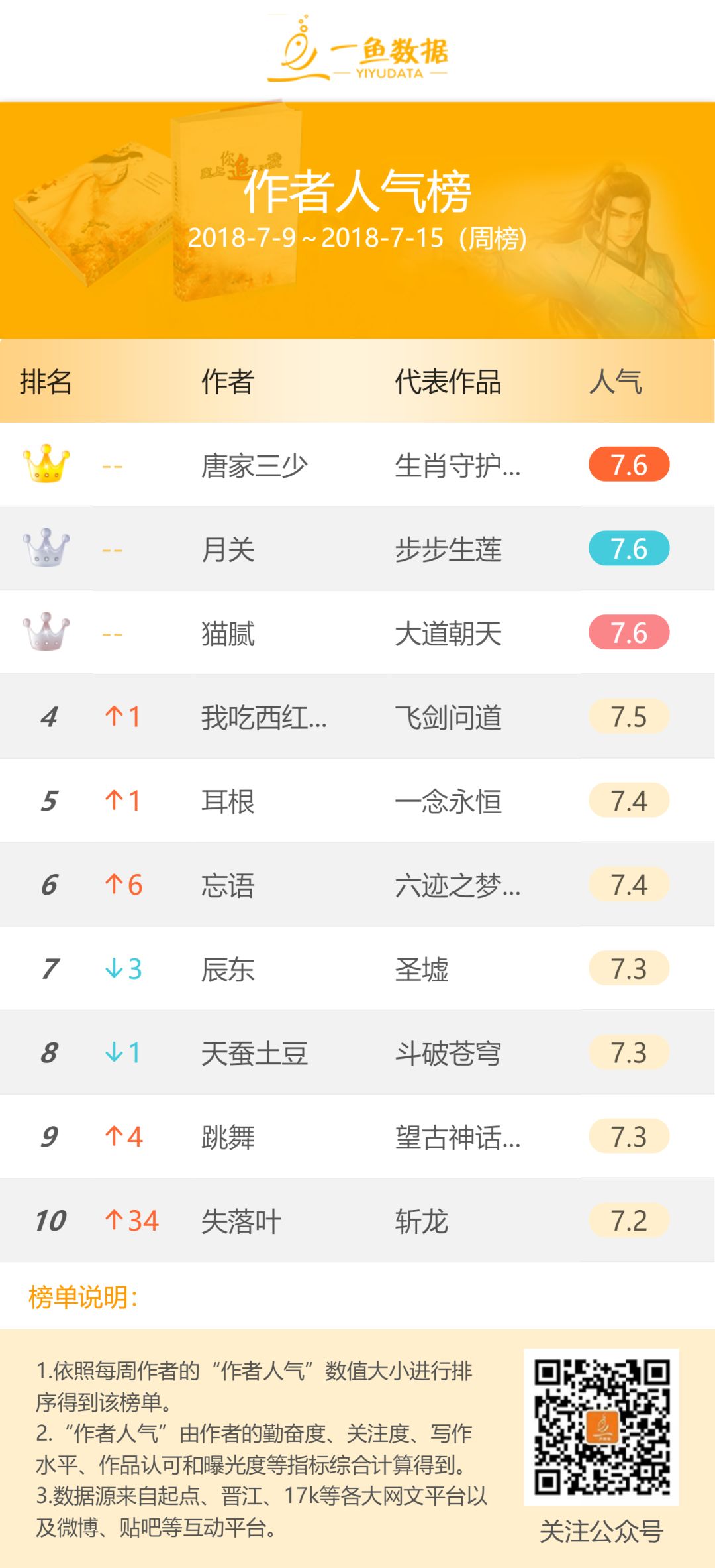 一鱼作者榜 唐家三少人气不减 八月薇妮 七星二连冠 一鱼数据 微信公众号文章阅读 Wemp